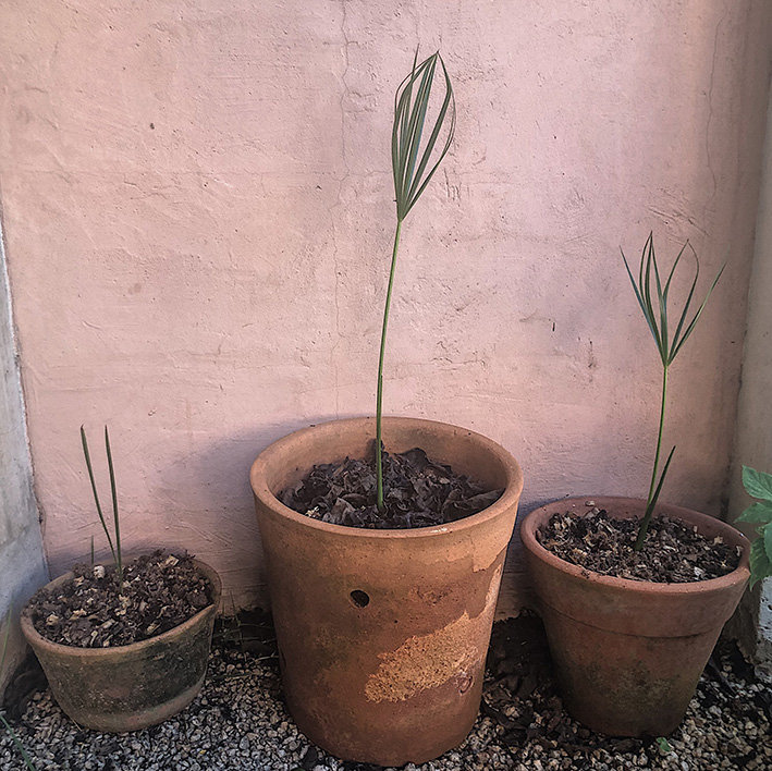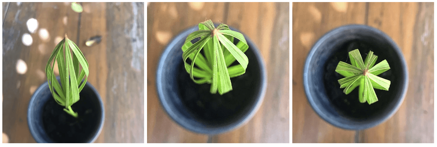 Continue regando diariamente (em épocas chuvosas você pode intercalar um pouco mais os dias). No início deixe o vasinho na sombra e assim que a planta atingir uns 30 centímetros coloque em um local com média incidência solar e, aos poucos, assim que esteja mais desenvolvida, em sol direto. Como aqui onde moro é muito seco, funcionou bem manter na sombra por um período. Quando ela começa a se desenvolver, a palmeira em estágio inicial forma uma cúpula muito bonita e perfeita com as primeiras folhas, é muito lindo observar pois tem uma geometria que impressiona. As minhas mudas de buriti ainda estão bem pequenas, vou conservar em vaso por um tempo e, então, avaliar um bom local para elas aqui em casa ou em alguma região mais alagada. Veremos! Agora é viver no tempo do buriti e aguardar.