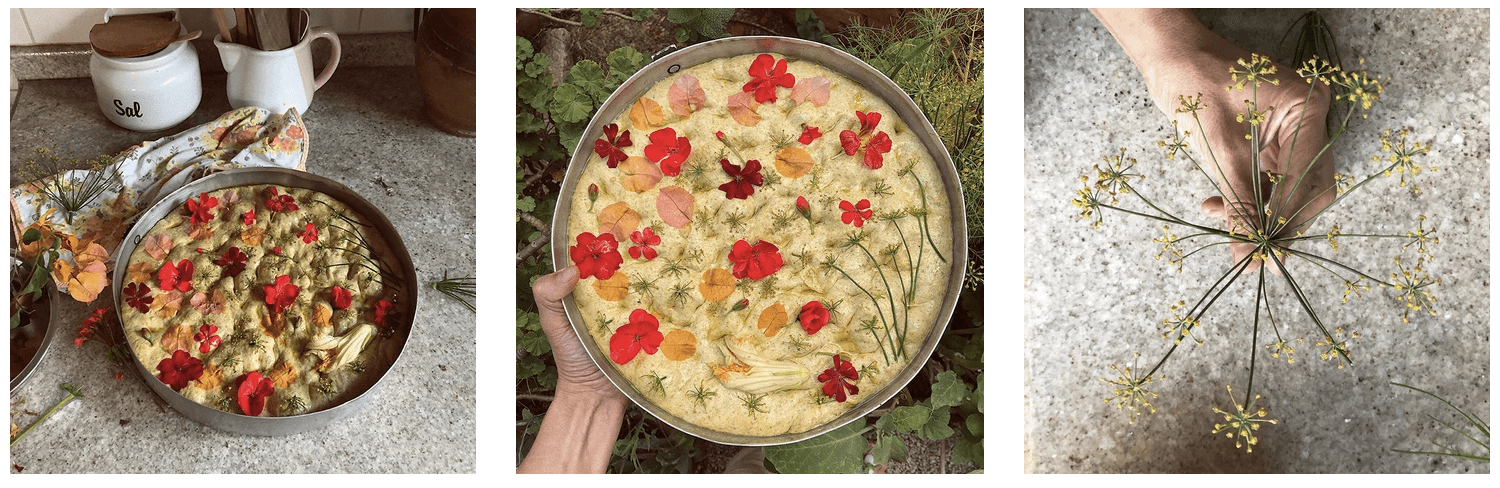7. Preaqueça o forno a 250 graus por 10 minutos. Enquanto isso, finalize a focaccia, colocando mais azeite na superfície, de modo que todo o pão esteja besuntado. Afunde os dedos novamente e a distribua melhor pela fôrma, delicadamente. A massa deve estar cheia de gás, por isso é preciso manipular com todo o cuidado. Finalize com as flores comestíveis e, se desejar, flor de sal ou sal grosso (eu geralmente não coloco mais sal). Leve ao forno por aproximadamente 30-40 minutos ou até dourar.